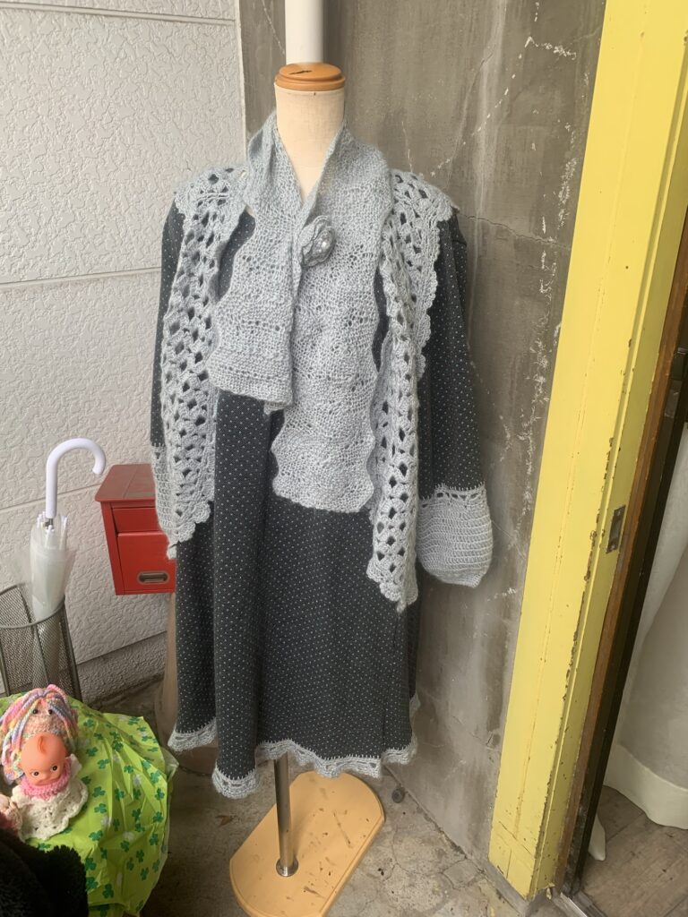 ワンコーディネート 2025年12月20日 最終更新日時 : 2025年12月20日 奥村三重子生地と手編みのコラボニットの生地に編み出しで裾、袖を編みました。同じ糸でベストとストール、ブローチを編みました。ワンコーディネートです。下にレギンスを履いても良いと思います。サイズ LL品番 OC1価格 ¥19,800