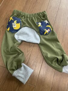 動きやすいパンツです 素材は綿 股にマチ裾とにリブが付いた動きやすいパンツです。 ワンポイントのポケットは柄もので。 サイズ:Baby 90価格: