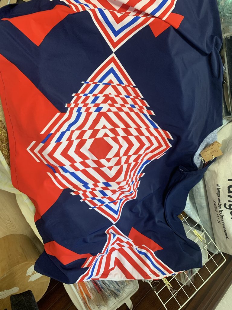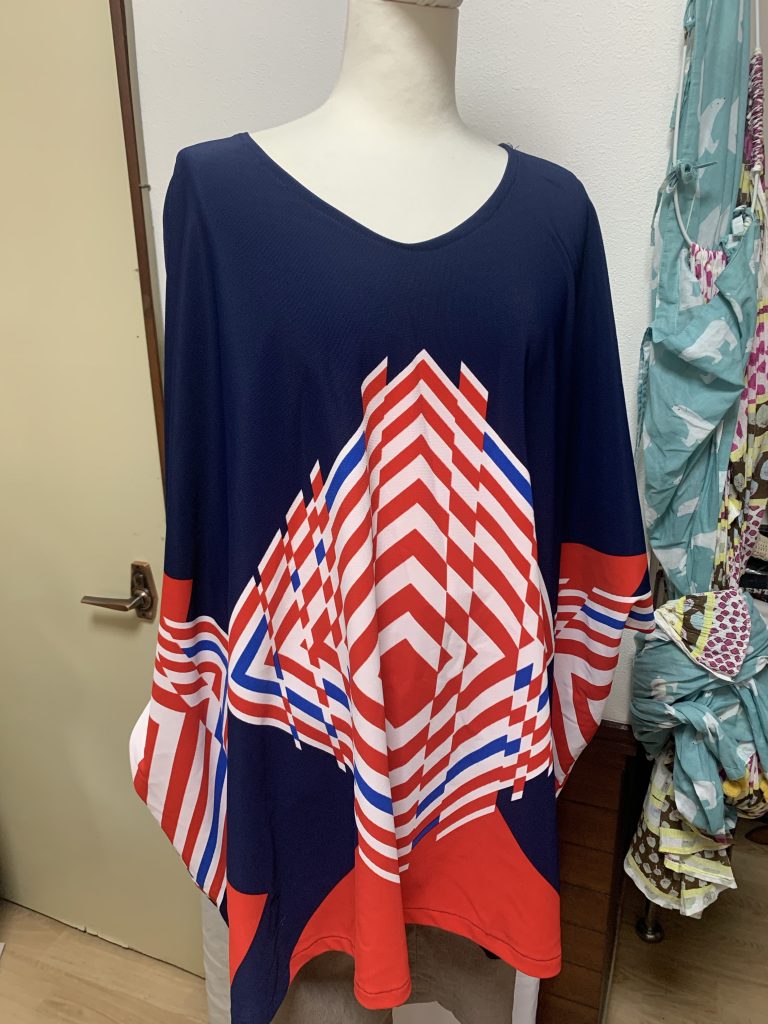パネル柄チュニック 2021年7月24日 最終更新日時 : 2021年9月11日 奥村三重子パネル柄の生地です。ハサミを入れたのは、衿ぐりです。サイズ 衿周り 70cm 着丈 72cm 袖口 40cm価格 ¥4,500商品番号 TU2